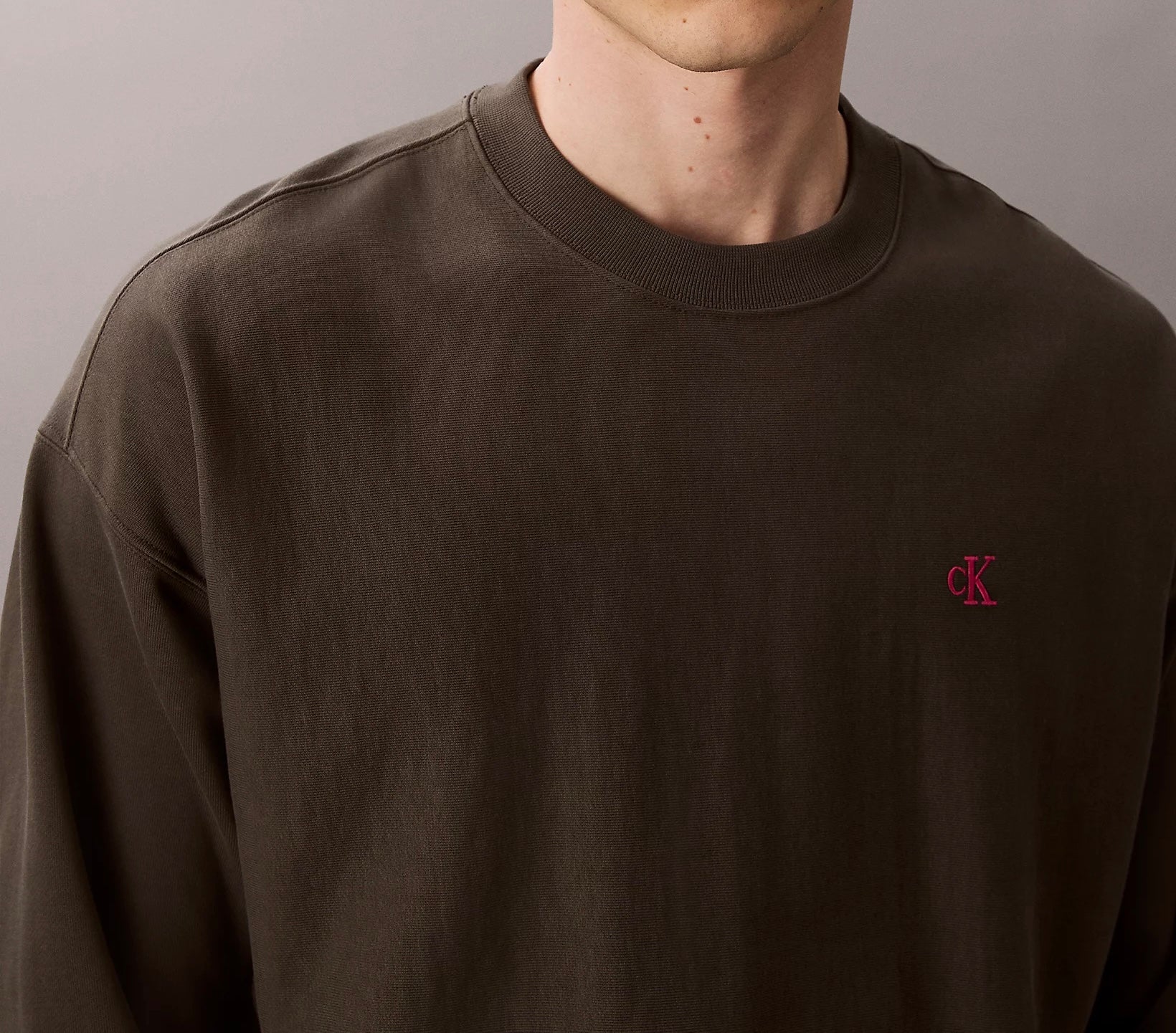 Il colore marrone scuro dona al capo un aspetto elegante e moderno, perfetto per chi cerca una sfumatura diversa dal solito nero o grigio. Sul petto spicca l’iconico logo cK ricamato in rosa, un dettaglio raffinato che aggiunge carattere senza risultare invadente.