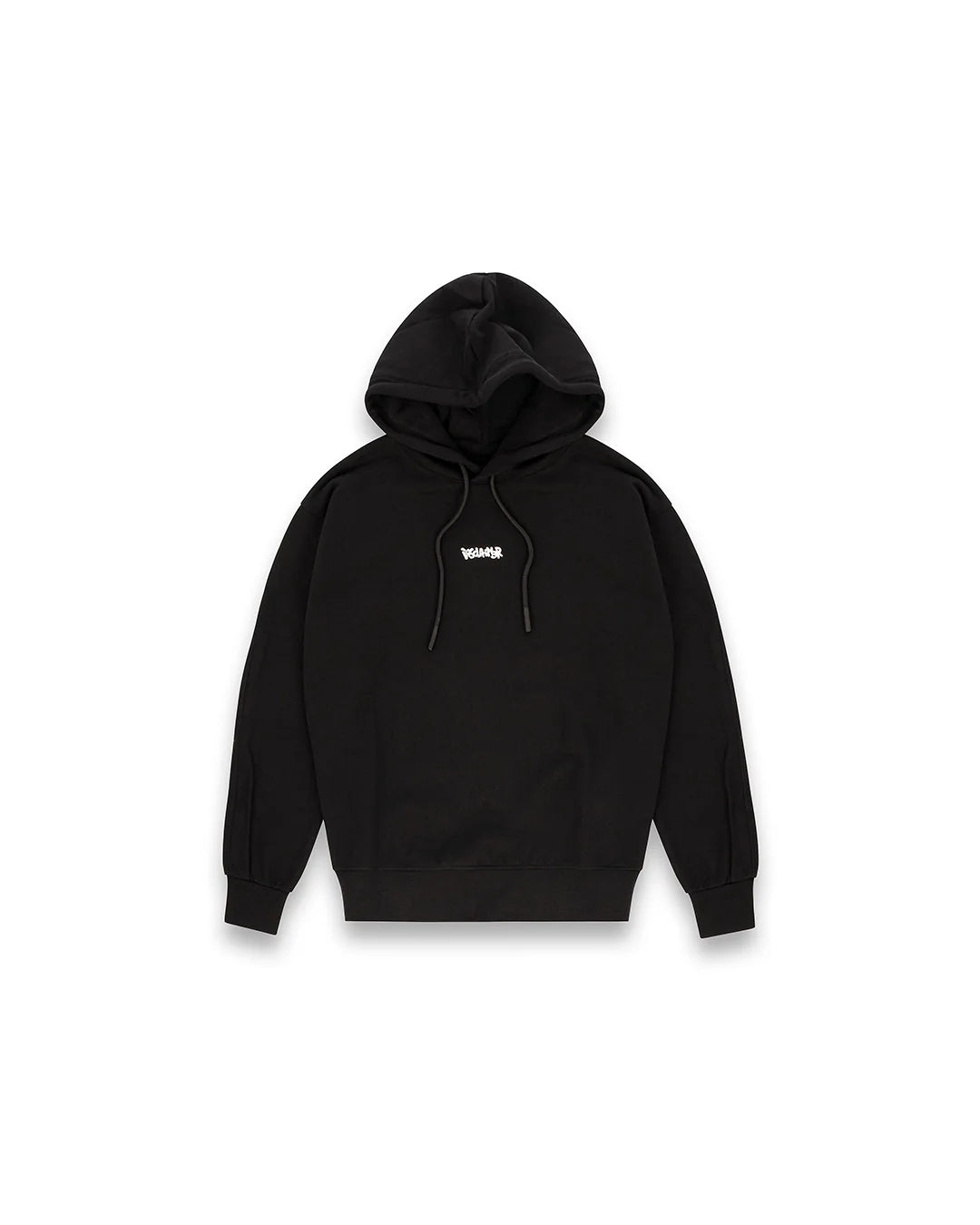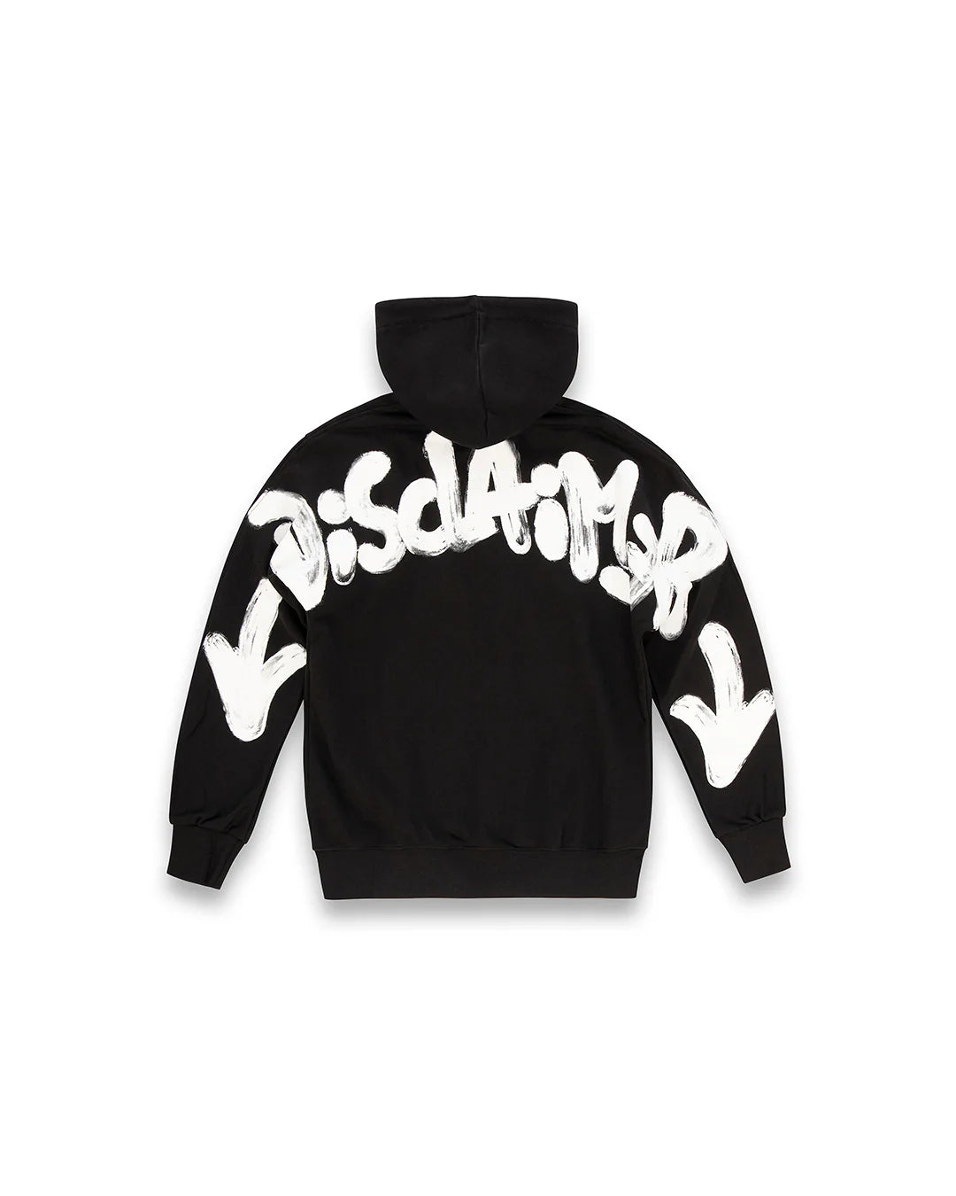 Un classico del mondo streetwear rivisitato in chiave artistica: la felpa Disclaimer nera con logo frontale minimal e maxi grafica effetto graffiti bianca sul retro e sulle maniche.