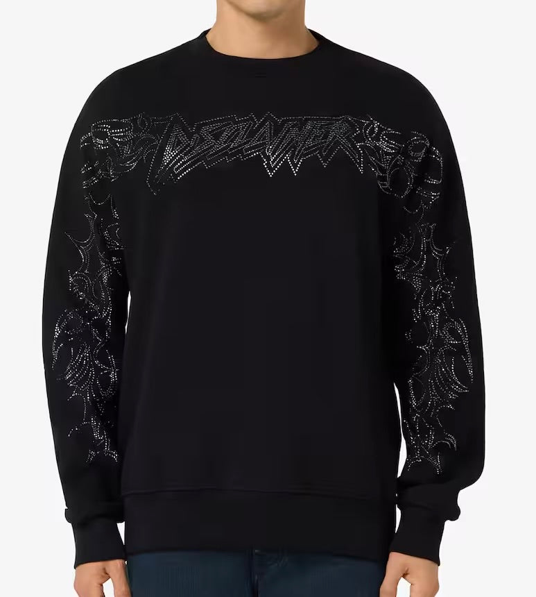Eleva il tuo stile street con la felpa Disclaimer nera arricchita da strass lucenti che formano il logo e decorazioni in stile tribal sulle maniche e sul petto.