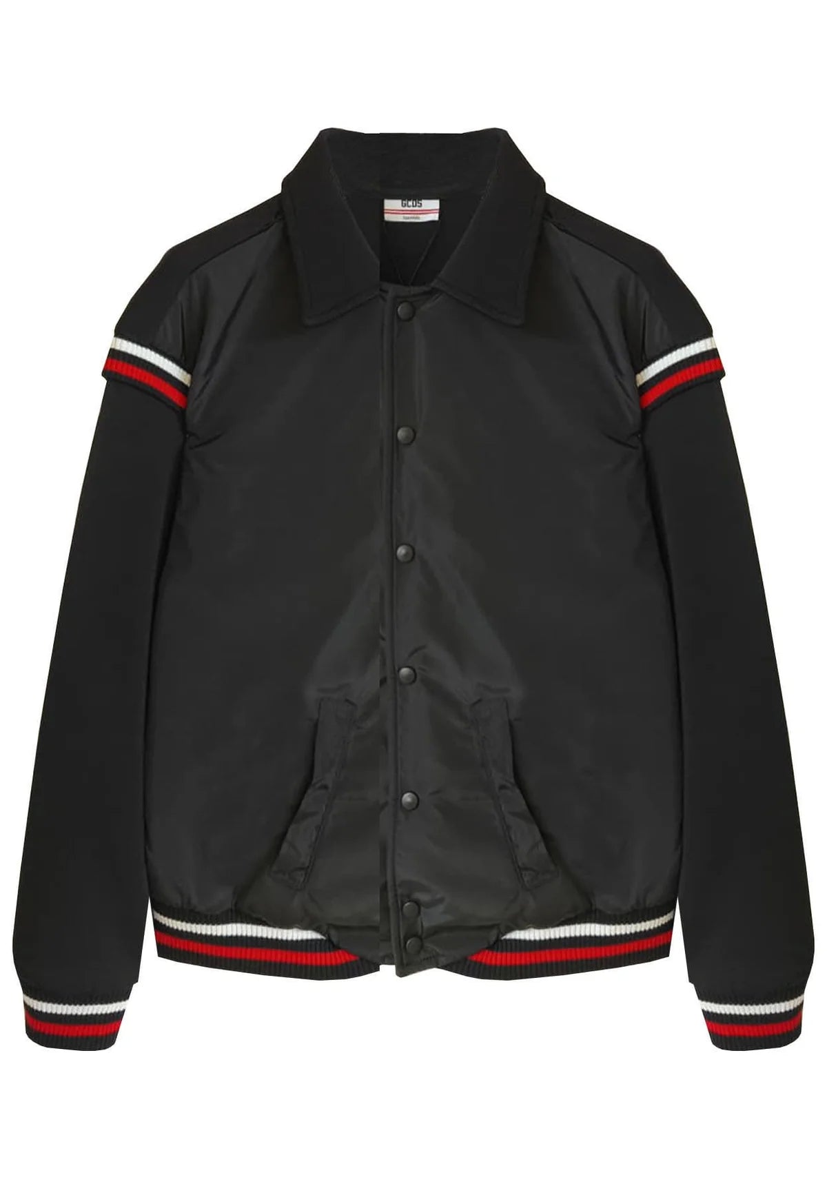 Ispirata allo stile varsity americano, la giacca GCDS combina linee classiche con dettagli iconici del brand. Realizzata in tessuto tecnico nero, presenta chiusura con bottoni automatici, colletto a camicia e polsini, fondo e spalle rifiniti con bande a righe nei toni del rosso, bianco e nero.