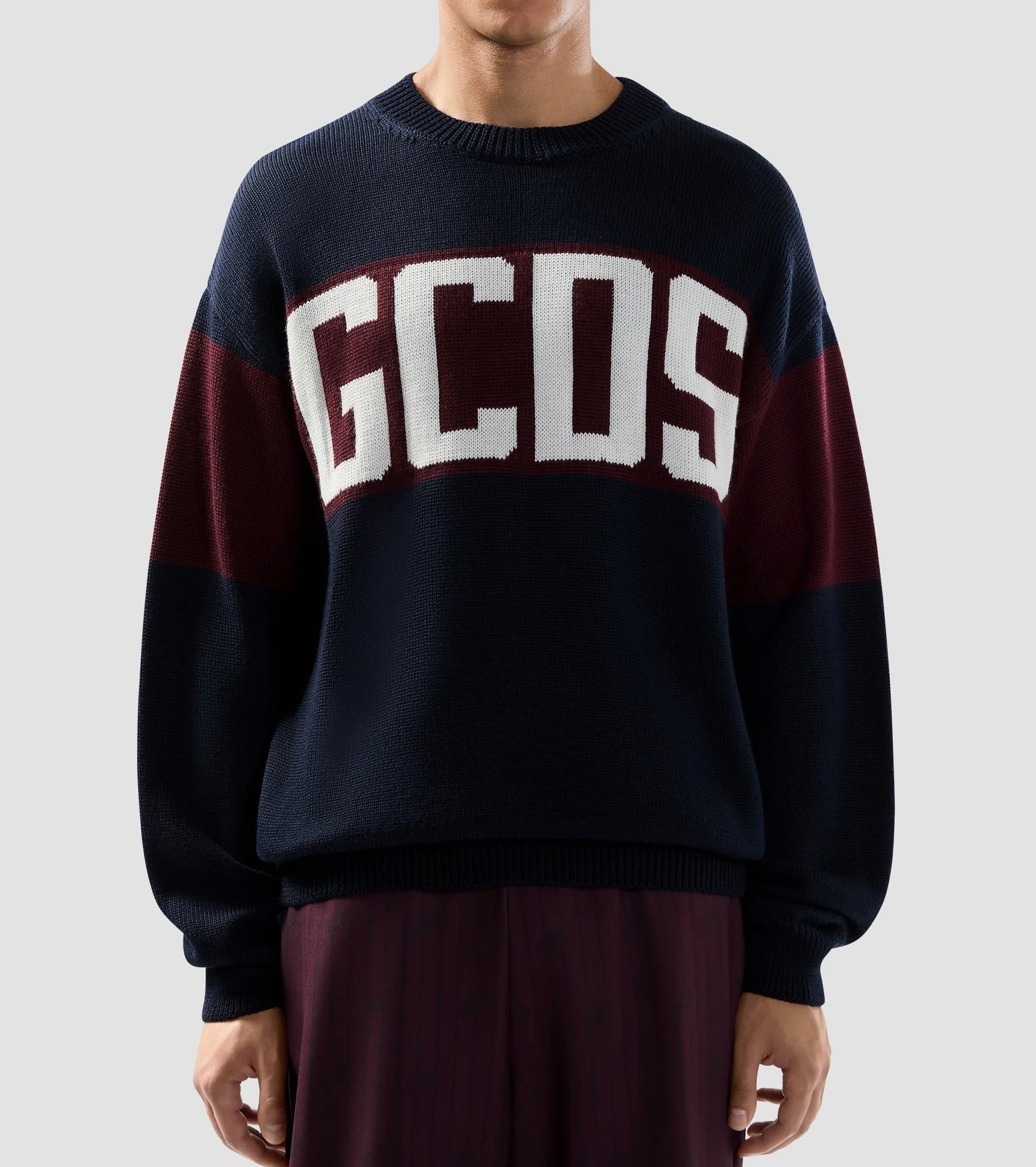 Un classico dello stile urban reinterpretato con l’inconfondibile tocco GCDS. Questo maglione in lana e cotone unisce comfort, calore e design distintivo. Il modello presenta una base blu navy con una fascia orizzontale bordeaux a contrasto e il maxi logo GCDS lavorato a maglia in bianco sul petto, per un look iconico e riconoscibile.